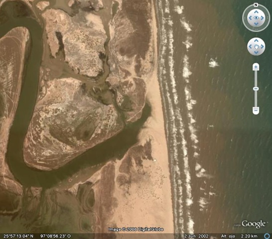 Río Grande (los que no son norestenses le llaman Río Bravo), «desembocando» en el golfo.